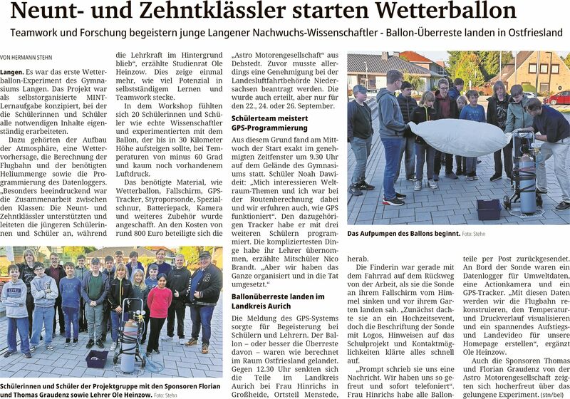 Als die Anfrage des Gymnasium Langen kam, ein MINT - Projekt für Schüler und Schülerinnen der Klassen 9 und 10 zu fördern, musste Geschäftsführer Thomas Graudenz nicht lange überlegen: Er sagte eine entsprechende Spende zu und ließ es sich nicht nehmen, gemeinsam mit dem Nachwuchs der Technischen Leitung der Motorenmanufaktur Florian Graudenz, beim Start des Wetterballons dabei zu sein und mitzufiebern, wie weit es der Ballon schaffen würde.
