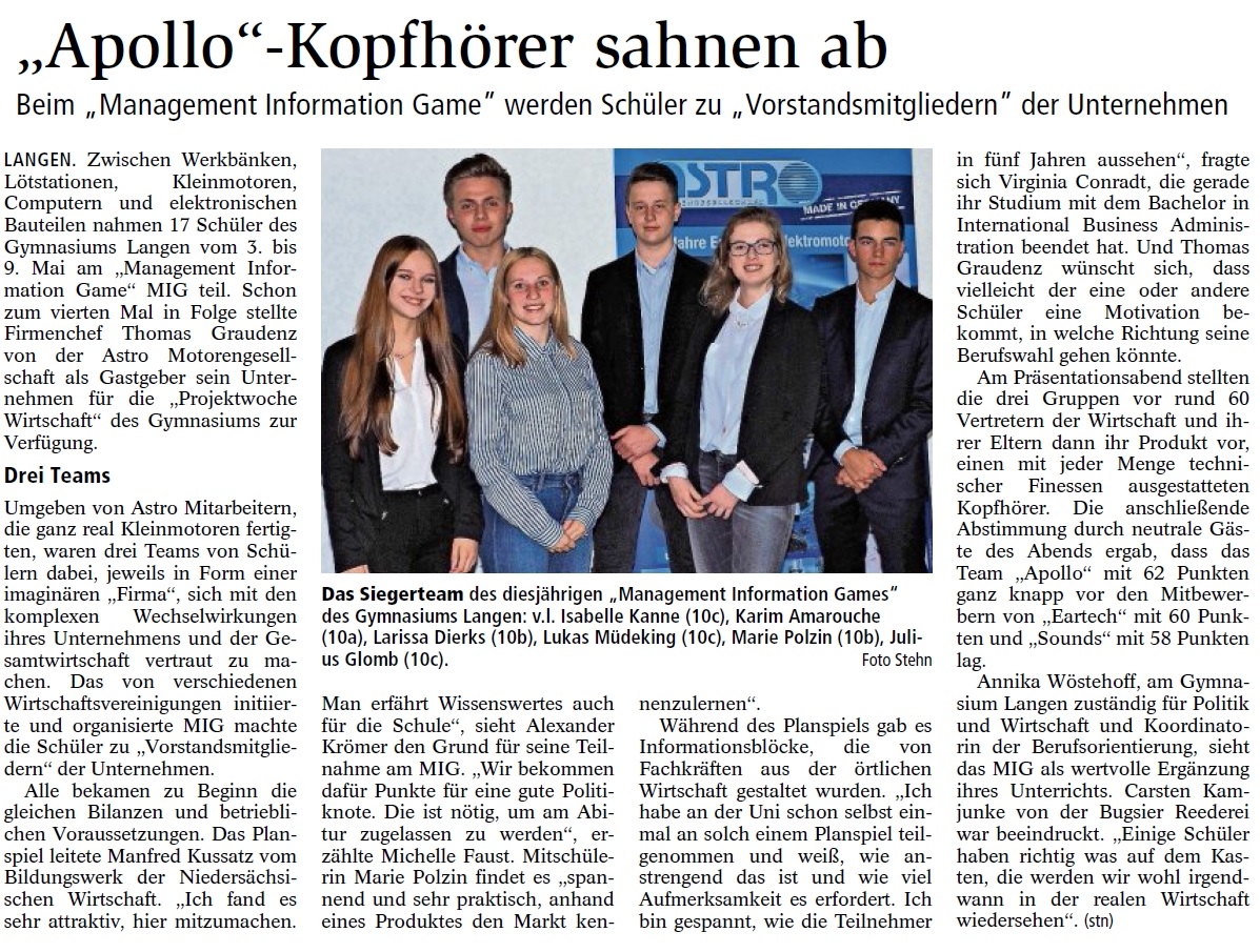 Die Schüler treten dabei als Unternehmensvorstand auf und müssen Materialien einkaufen, Preise kalkulieren, das Personal und die Entwicklung am Markt im Auge behalten. Sie hören interessante Vorträge und spielen ein gesamtes Geschäftsjahr innerhalb von 5 Tagen durch.